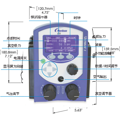 ? 所有的數字多功能顯示器能同時讀出氣壓、時間、真空、點膠注射計數和時間。